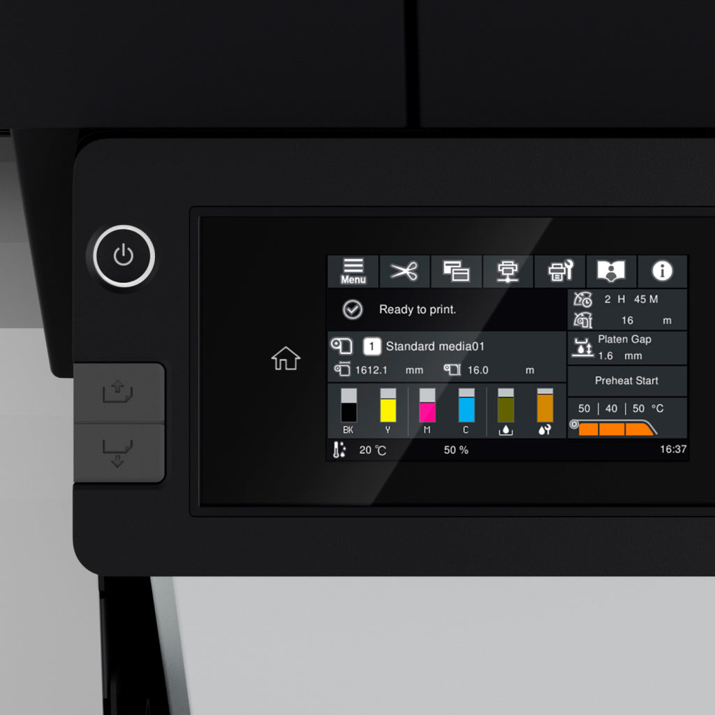 Fabricada com base na plataforma confiável da geração anterior, o sistema preciso de manuseio da mídia da SureColor® S7170 vem acompanhada da nova e mais larga cabeça de impressão PrecisionCore® Micro TFP® de 1,33", capaz de velocidades de impressão mais elevadas1. A Tecnologia NVT de Verificação de Bicos ajuda a garantir um funcionamento estável, enquanto a maior aproximação entre o sensor de temperatura e a placa de bicos aumenta a uniformidade da cor. Um sistema ISS de alimentação de tinta recém-desenvolvido substitui cartuchos volumosos por bolsas de 800 ml com grande volume de tinta2, ajudando a reduzir resíduos de plástico e a evitar uma troca frequente de tinta. A SureColor S7170 é compatível com uma ampla variedade de mídias, incluindo vinil, PVC, papel e lona, visando atender as necessidades dos seus clientes — com uma só impressora.